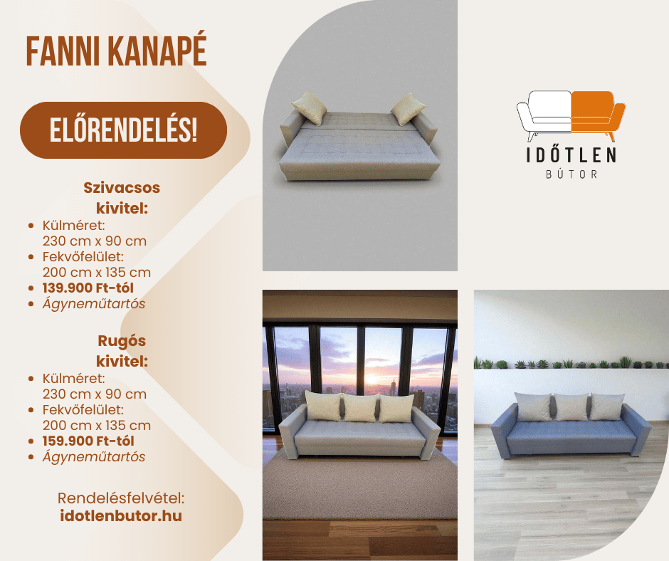 Fanni kanapénk gondos tervezésünk legújabb szüleménye. Fiatalos megjelenése párosul a kényelemmel és az időtlen dizájnnal. Az Időtlen Bútor kínálatában 2025 októberében raktárról azonnal elvihető. A készleten található bútor főbb jellemzői: